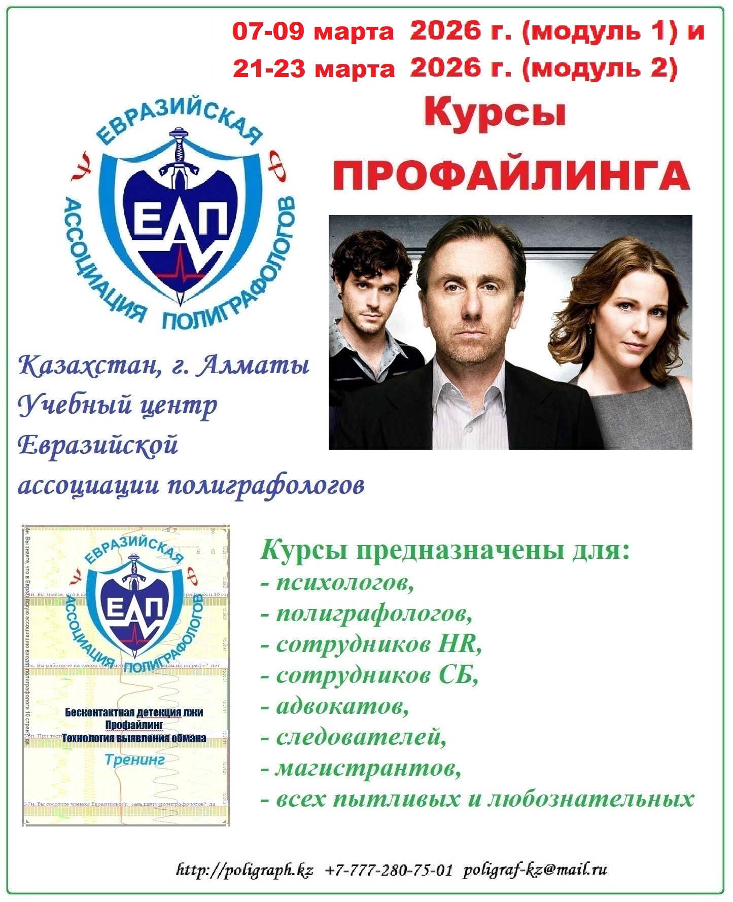 - Евразийская ассоциация полиграфологов оказывает следующие услуги: - проведение обучающих семинаров по прикладной психофизиологии (инструментальной детекции лжи), профайлингу, графологии и др.; - помощь и консультации по приобретению и использованию полиграфов и другого психофизиологи-ческого оборудования; - проведение психофизиологического обследования с применением полиграфа («детектора лжи») в целях оценки достоверности информации, сообщаемой человеком; - профессиональную защиту от неправомерного и неквалифицированного применения полиграфа.